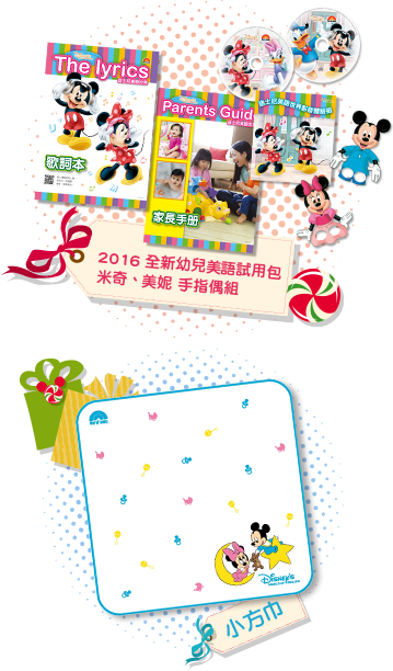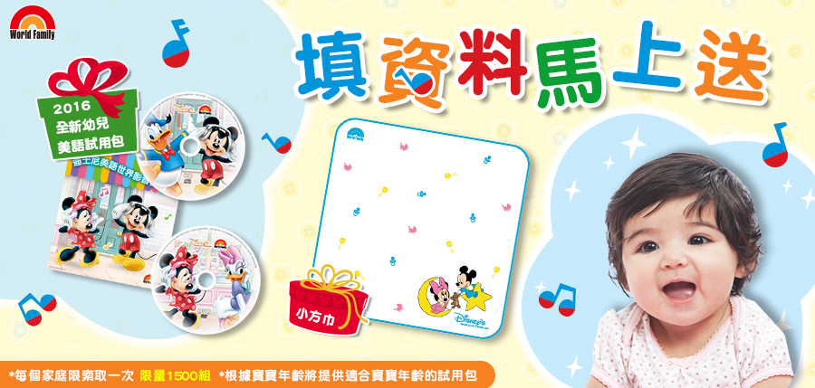 2. 活動期間內請於表格中填寫正確資料並送出,若因資料填寫不完全,本公司將不寄送贈品。迪士尼美語世界試用包將於資料送出後10天內送達府上。(曾索取過本贈品的家庭,恕不再寄送)
